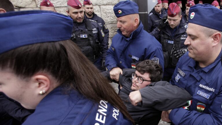 Hungarian police remove a protester blocking the entrance of the Parliament building…