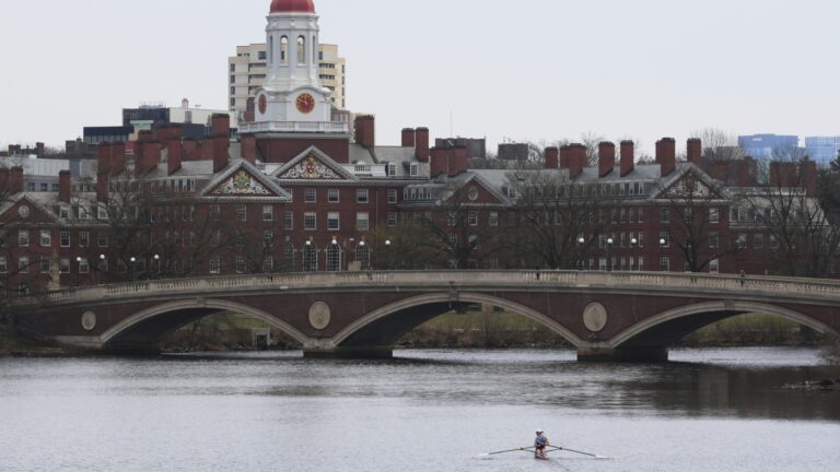 A sculler rows down the Charles River near Harvard University, at rear,…