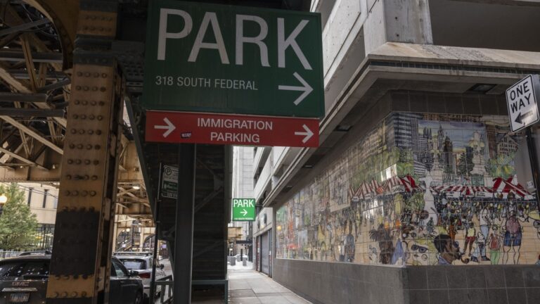 Signs direct traffic to the immigration court parking lot in Chicago, Ill.,…
