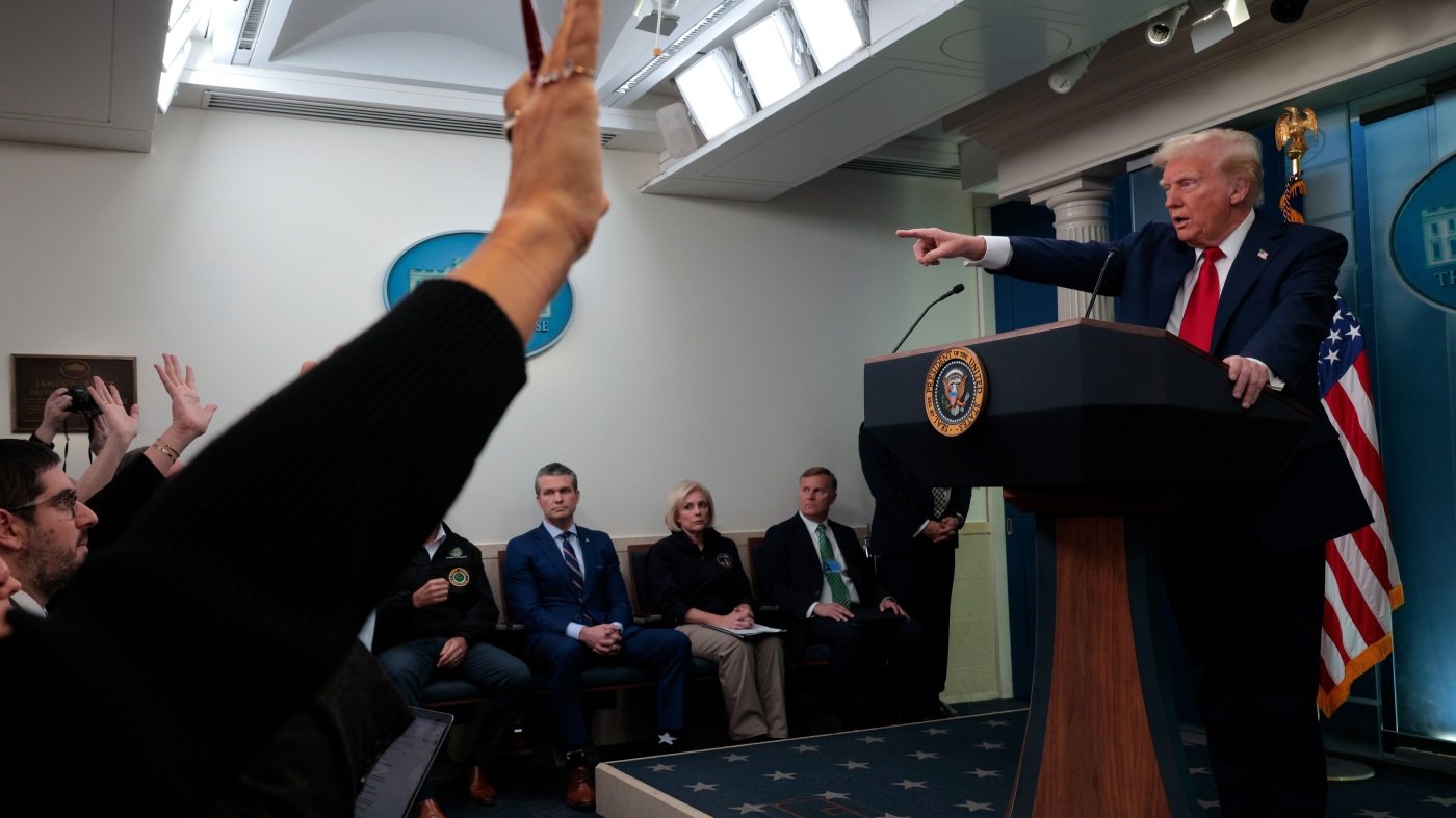 President Trump takes questions from reporters at the White House on Thursday about the collision of an American Airlines flight with a military Black Hawk helicopter near Ronald Reagan Washington National Airport.