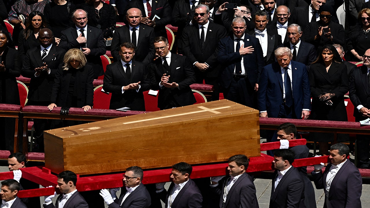 Published 26. April 2025. 9:08 edt Figure 1 of 14 following People gather as they wait to see how Pope Francis is heard, on the day of the funeral mass of Pope Francis in St. Peter Square, in Rome, Italy, April 26, 2025. Reuters/Kevin Coombs (Reuters/Kevin Coombs) Figure 2 of 14 prev following The hearing that wears the coffin of Pope Francis drives through Corso Vittorio on the day of his funeral, in Rome, Italy, April 26, 2025. Reuters/Matteo Ciambelli (Reuters/Matteo Ciambelli) Figure 3 out of 14 prev following Hearse transfers the coffin of Pope Francis in the papal basilica of St. Mary Major (Santa Maria Maggiore) on the day of his funeral, in Rome, Italy, April 26, 2025. Reuters/Hannah McKay (Reuters/Hannah McKay) Figure 4 of 14 prev following People attend the funeral mass of Pope Francis, in St. Peter’s Square, in the Vatican, April 26, 2025. Reuters/Remo Casilli (Reuters/Remo Cquilli) Figure 5 of 14 prev following Faithful and priesthood members attend the funeral mass of Pope Francis, in St. Peter Square in the Vatican, April 26, 2025. Reuters/Kai Pfaffenbach (Reuters/Kai Pfaffenbach) Figure 6 of 14 prev following People attend the funeral mass of Pope Francis in the Vatican, April 26 2025. Reuters/Yara Nardi (Reuters/Yara Nardi) Figure 7 of 14 prev following Italian Prime Minister Giorgia Meloni appears in front of Pope Francis’s funeral mass, in St. Peter’s Square, in the Vatican, April 26, 2025. Reuters/Dylan Martinez (Reuters/Dylan Martinez) Figure 8 of 14 prev following Former US President Joe Biden and his wife Jill Biden walk in front of Pope Francis funeral Mass, in the Vatican, April 26, 2025. Reuters/Remo Casilli (Reuters/Remo Cquilli) Figure 9 of 14 prev following US President Donald Trump and the First Lady of Melania Trump attend the funeral mass of Pope Francis in St. Peter Square in the Vatican, April 26, 2025. Reuters/Dylan Martinez (Reuters/Dylan Martinez) Figure 10 of 14 prev following US President Donald Trump, First Lady of Melania Trump, France President Emmanuel Macron and his wife Brigitte Macron standing while the coffin is worn on Pope Francis’ Day at St. Peter Square in Vatican, April 26, 2025. Reuters/Dylan Martinez (Reuters/Dylan Martinez) Figure 11 of 14 prev following Ukrainian President Volodymyr Zelenkoy and the first lady Olena Zelenska attend the funeral mass of Pope Francis at St. Peter Square in the Vatican, April 26, 2025. Reuters/Nathan Howard Figure 12 of 14 prev following President of Argentina Javier Milei Gestiture, in front of the funeral mass of Pope Francis, in the Vatican, April 26, 2025. Reuters/Yara Nardi (Reuters/Yara Nardi) Figure 13 of 14 prev following US President Donald Trump and President of Finland Alexander Stubb participate in Pope Francis Funeral Mass at St. Peter’s Square in the Vatican, April 26, 2025. Reuters/Nathan Howard (Reuters/Nathan Howard) Figure 14 of 14 prev US President Donald Trump and First Lady Melania Trump. French President Emmanuel Macron and his wife Brigitte Macron and Finland Alexander Stubb president attended Pope Francis funeral mass, in the Vatican, April 26, 2025. Reuters/Kai Pfaffenbach (Reuters/Kai Pfaffenbach) Source link