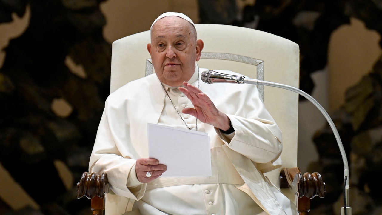 Pope Francis waved believers during his weekly general audience in the Paul VI Hall, February 5, 2025 in the Vatican, the Vatican. (Vatican media via the Vatican Pool/Getty Images)