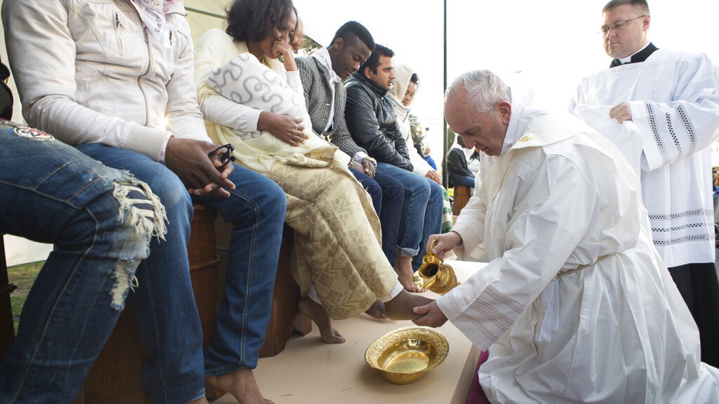 Pope Francis washes the feet of migrants at a refugee center near Rome in March 2016.