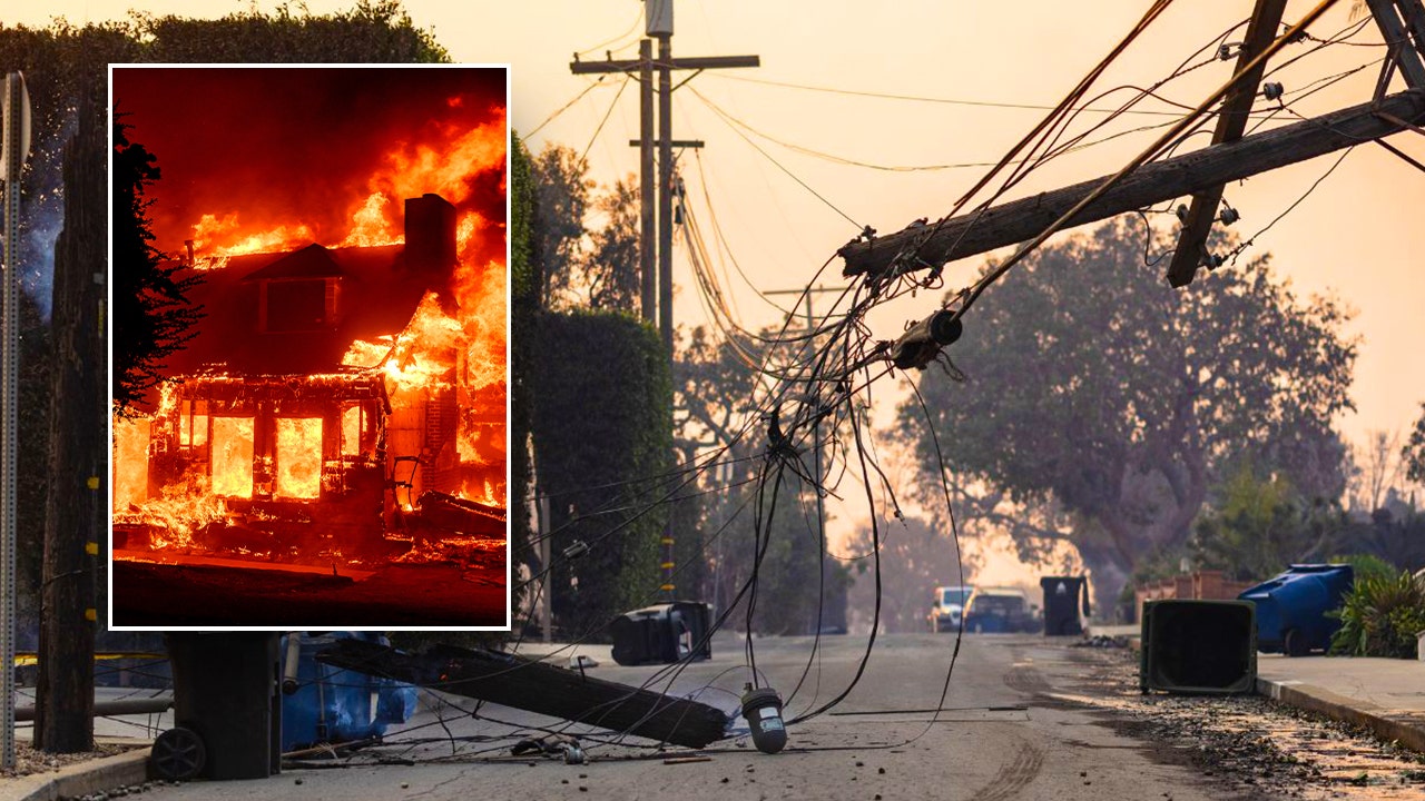 Power lines hang from broken power poles in the middle of a street caused by the Palisades Fire on January 8, 2025 in the Pacific Palisades community in Los Angeles, California. A company that monitors electrical activity says outages along the Los Angeles power grid have spiked in the same areas where three of this week’s large wildfires have occurred. (Jay L. Clendenin/Getty Images)