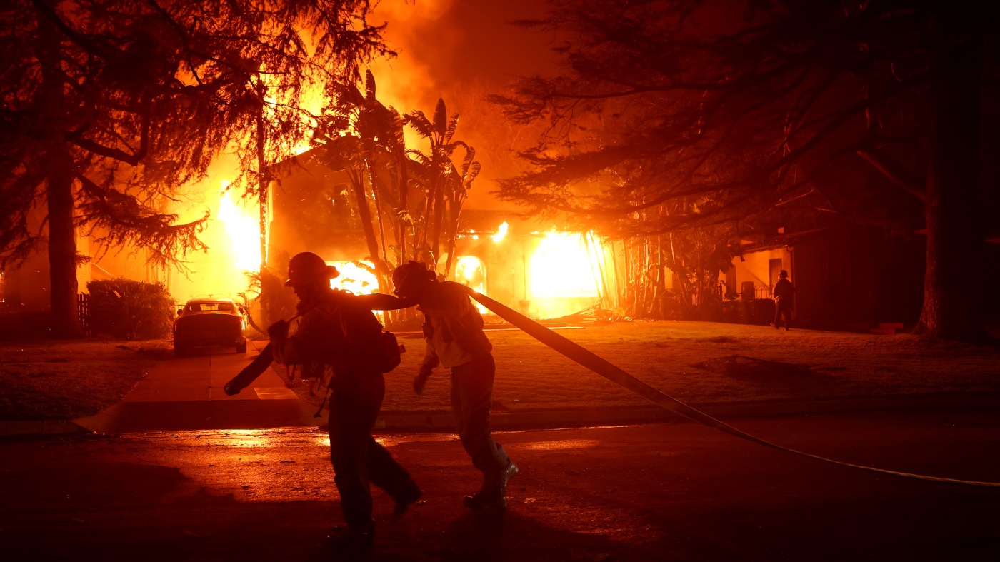Los Angeles County firefighters pull a hose in front of a burning home as the Eaton Fire moved through the area in Altadena, Calif., on Jan. 8.