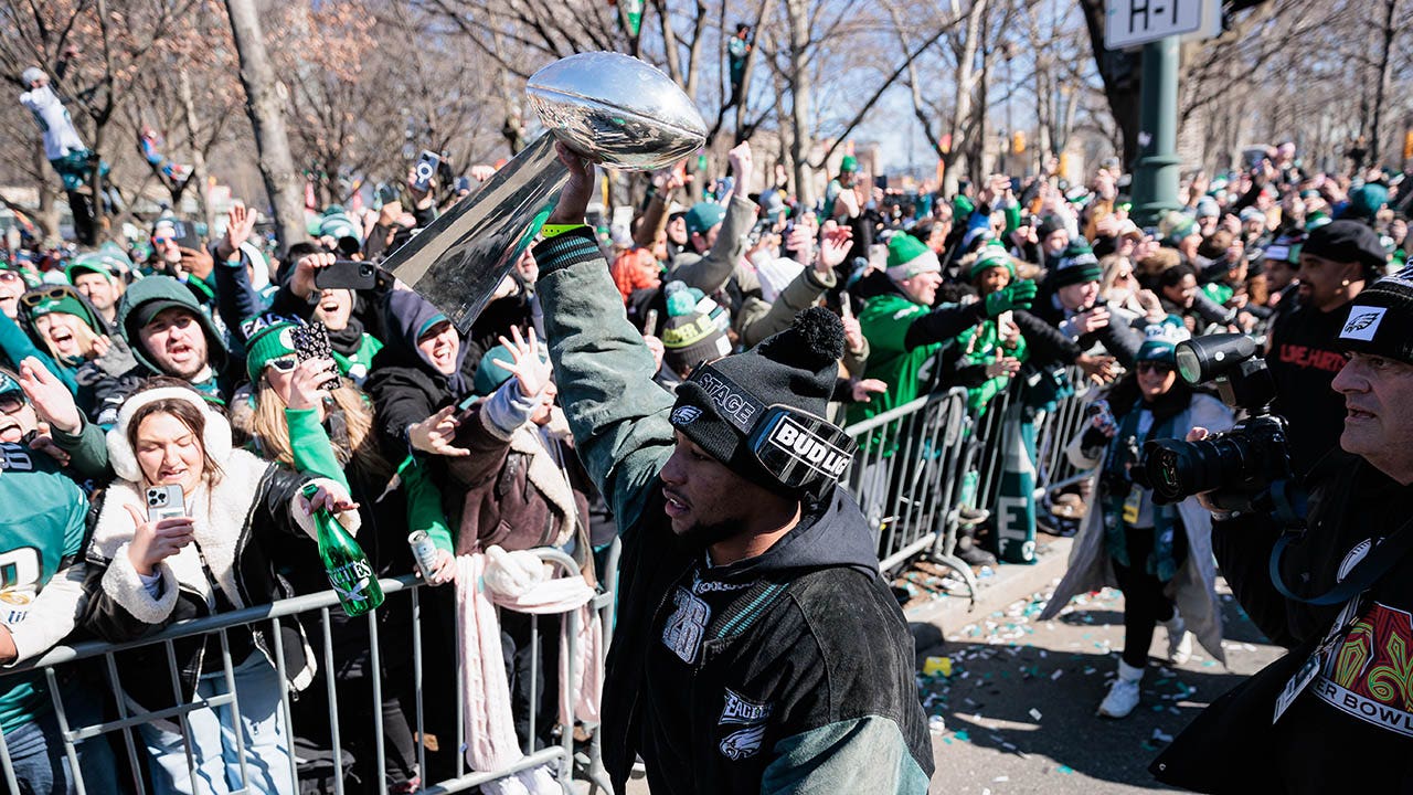 Saquo Barkley eagles run backwards, the center, holds the Vince Lombardi trophy during the Eagles Parade of the Super Bowl Championship on Friday, February 14, 2025. (Damian Giletto/Delaware News Journal/USA Today Network via Imagings Images)