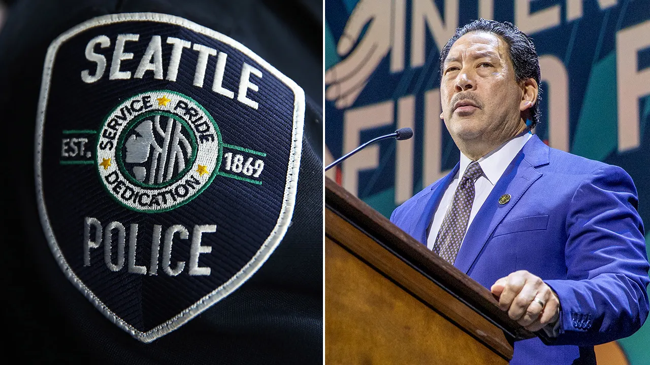 The Seattl Police Directorate Logotype and Mayor Seattle Bruce Harrell on a pedestal in Royal Blue suit