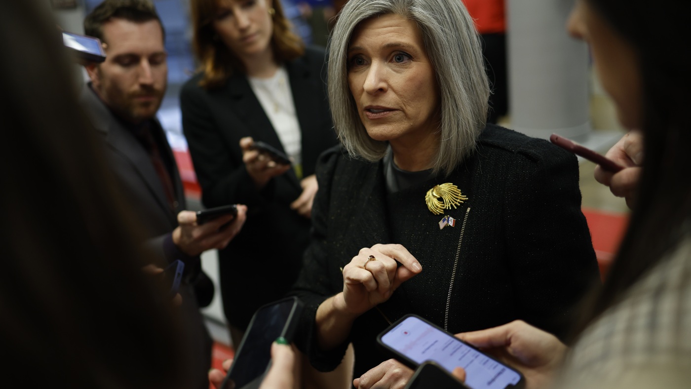U.S. Sen. Joni Ernst, R-Iowa, speaks to reporters as she walks to a Senate luncheons at the U.S. Capitol on Nov. 19, 2024.