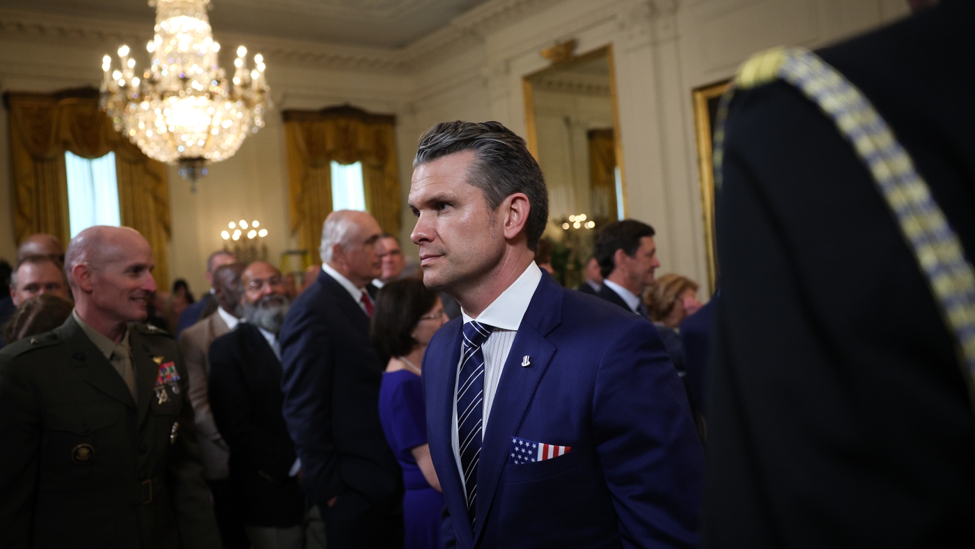 Secretary of Defense Pete Hegseth departs a presentation ceremony for the Commander-in-Chief Trophy to the U.S. Naval Academy Midshipmen football team in the East Room of the White House on April 15.