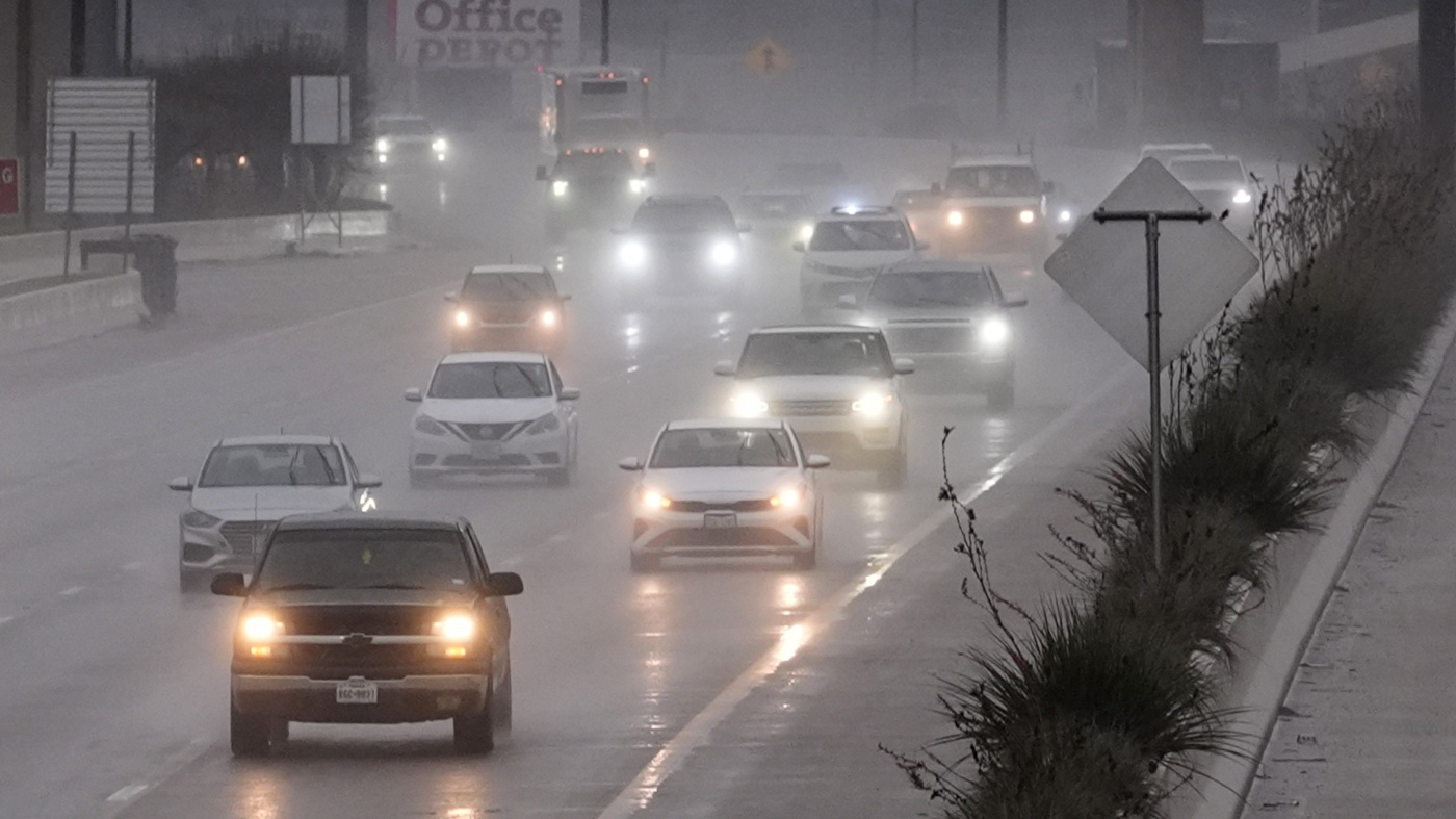 Vehicles make their way on a rain soaked highway in Dallas on Thursday.