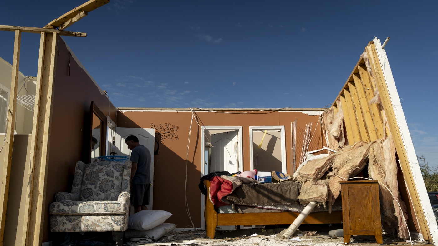 A person walks through a house in the community of Sunshine Hills outside of London, Kentucky. A tornado struck the neighborhood just after midnight on May 17.