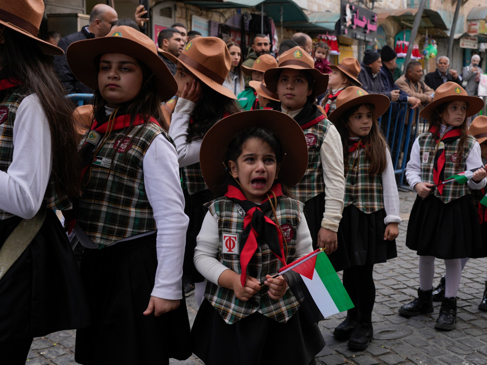 In central Bethlehem, the Terra Sancta Scout Troop, donning red scarves, marched down the main shopping street where vendors were selling nougat and shawarma.