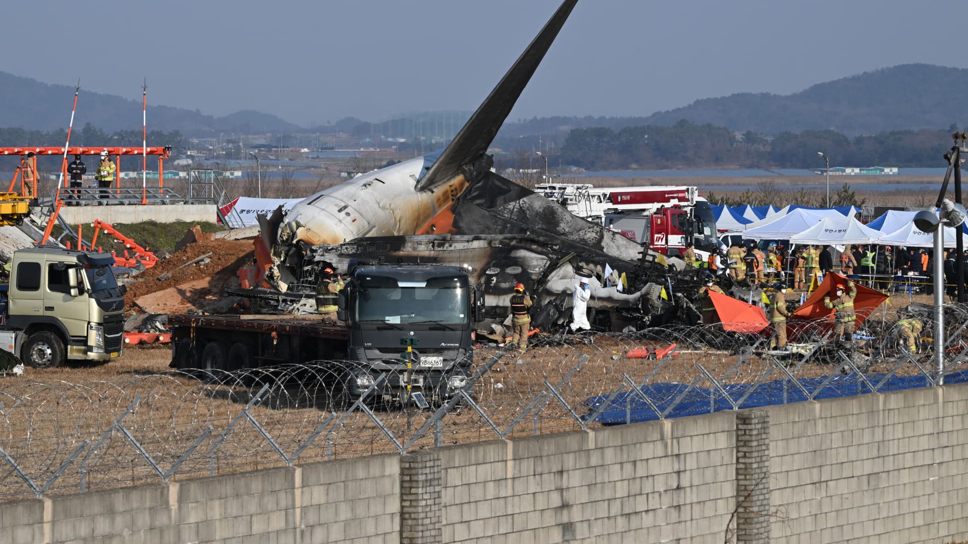 Firefighters and rescue personnel work near the wreckage of a Jeju Air Boeing 737-800 after the plane crashed and caught fire at Muan International Airport in South Jeolla Province, at about 288 kilometers southwest of Seoul on December 29, 2024.