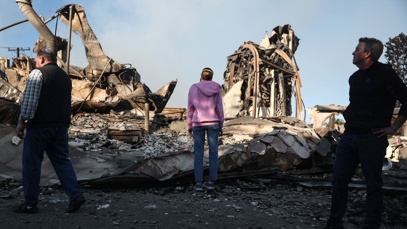Friday, Jan.10: Wildfire smoke and burned houses are seen from the Palisades Fire in the Pacific Palisades neighborhood.