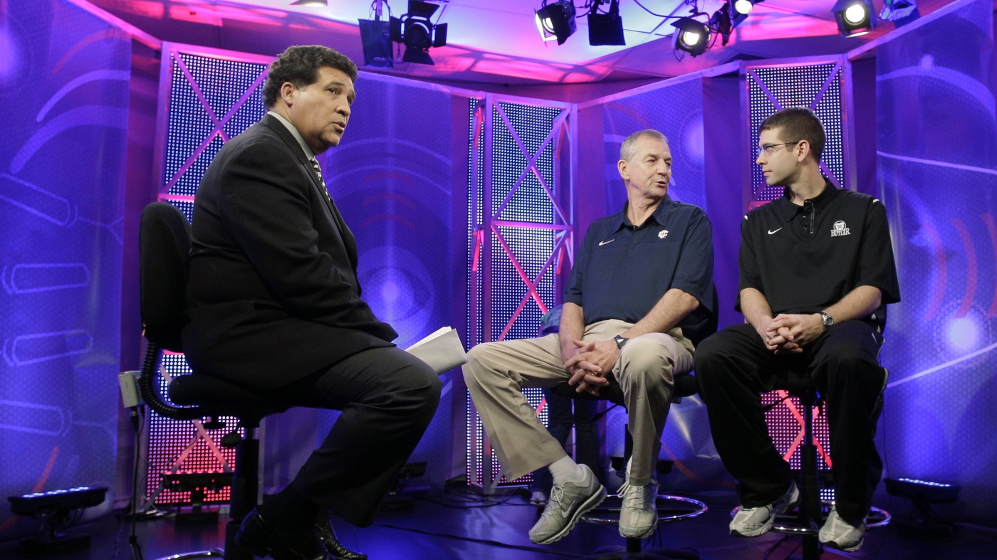 FILE – Greg Gumbel, left, watches as Connecticut head coach Jim Calhoun talks to Butler head coach Brad Stevens, right, prior to taping a television interview for the men’s NCAA Final Four college basketball championship game on April 3, 2011, in Houston.