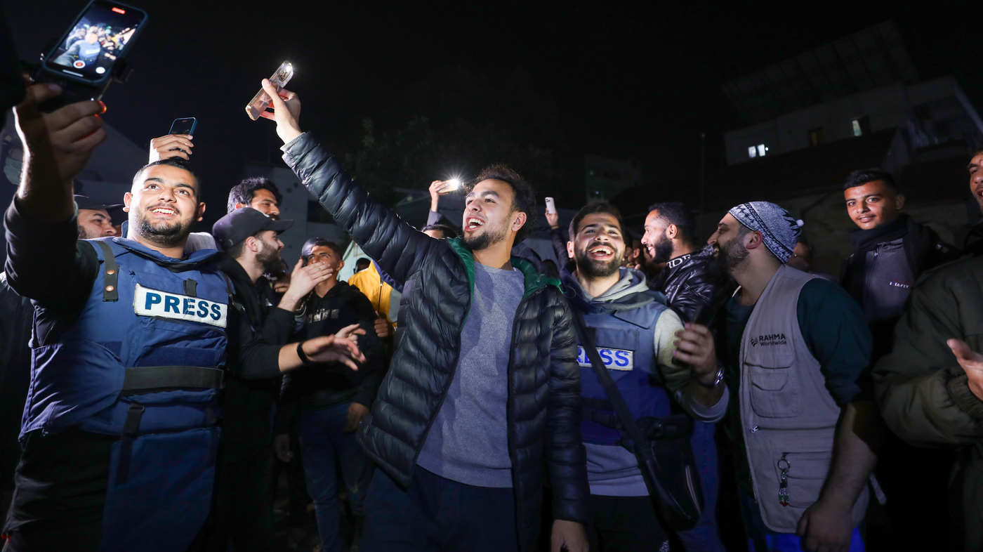 Palestinians gathered in the garden of Al-Ahli Baptist Hospital in Gaza to celebrate after US President-elect Donald Trump’s announcement of hostage deal, on January 15, 2025 in Deir al-Balah, Gaza.