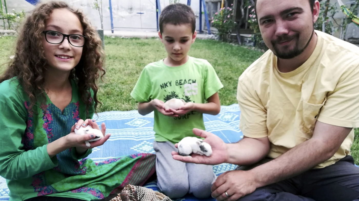 This family photo shows Ryan Corbett holding rabbits with his daughter Miriam and son Caleb in Kabul, Afghanistan in 2020.