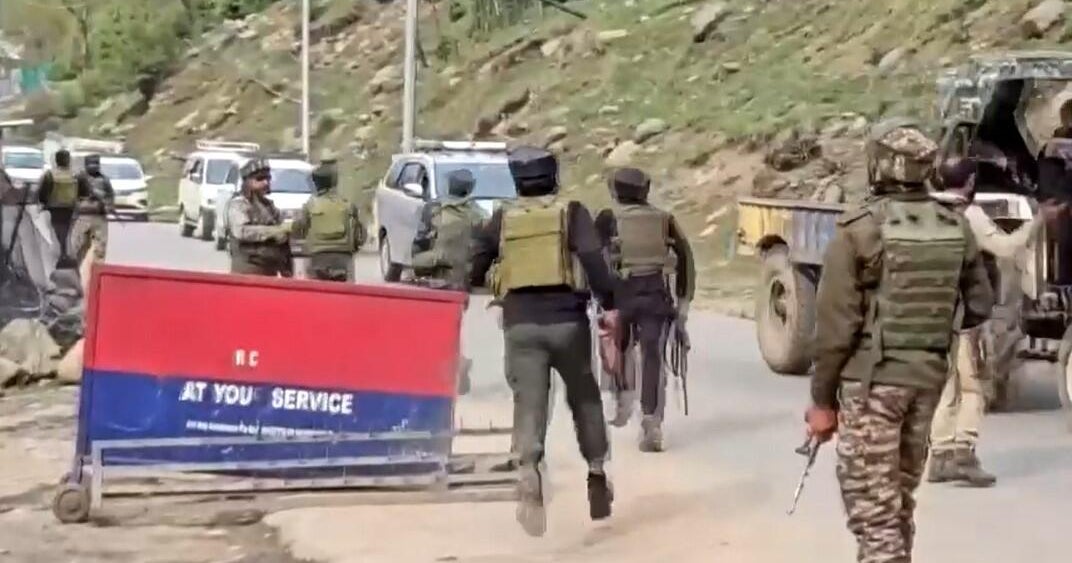 An image from video broadcast by India’s ANI news agency shows security forces near to the scene of a deadly attack on tourists by suspected militants in Indian-controlled Kashmir, April 22, 2025.