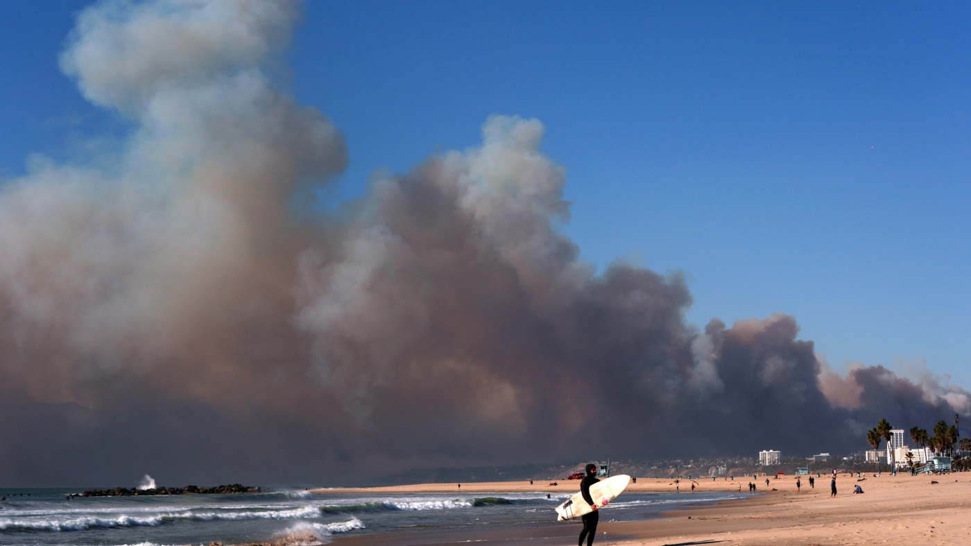 Tuesdau, Jan. 7: Smoke from a wildfire is seen from the Venice Beach section of Los Angeles, Calif.