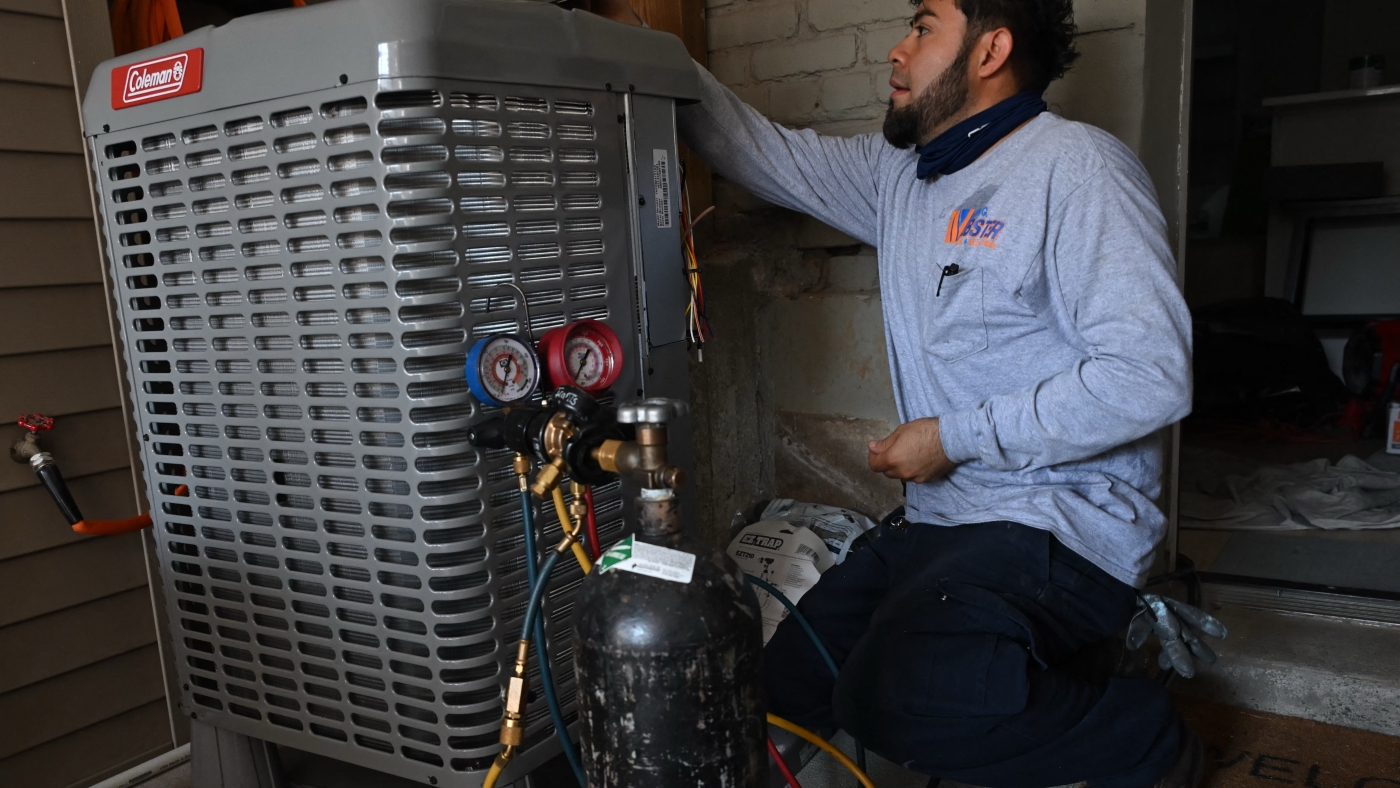 A technician installs an electrical heat pump at a home in Washington, DC, in August 2024.