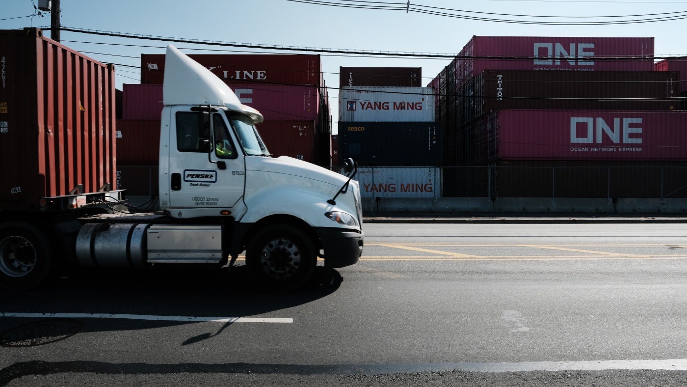 Trucks move past cargo containers at a port in Bayonne, N.J., in 2021. The state is adopting California’s Advanced Clean Trucks rules, which require at least 7% of medium- and heavy-duty vehicles sold in the state to be zero-emission for model year 2025. Dealers are petitioning for a delay, so far unsuccessfully.