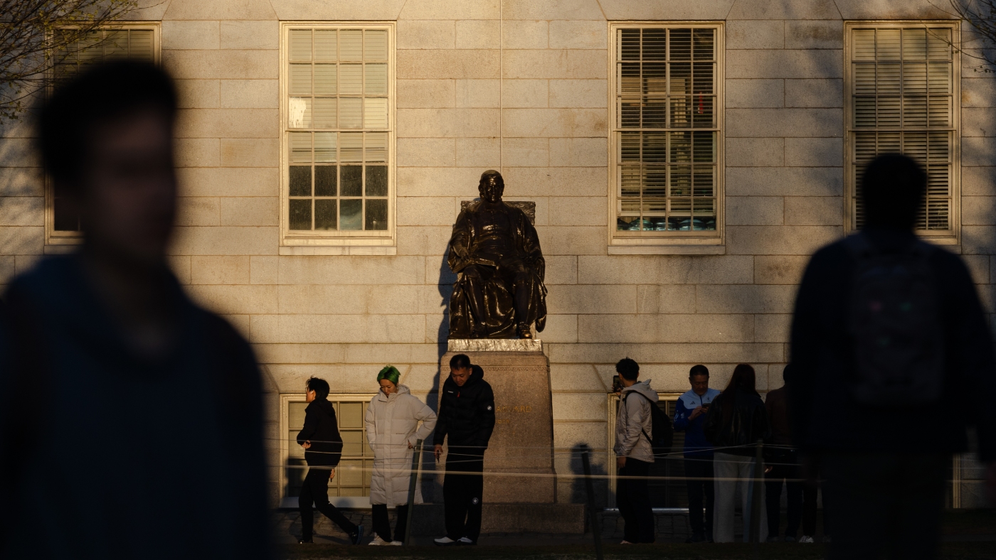 People gather to take photos with the John Harvard statue at Harvard University. President Trump made another threat to Harvard’s tax-exempt status in a social media post on Friday.