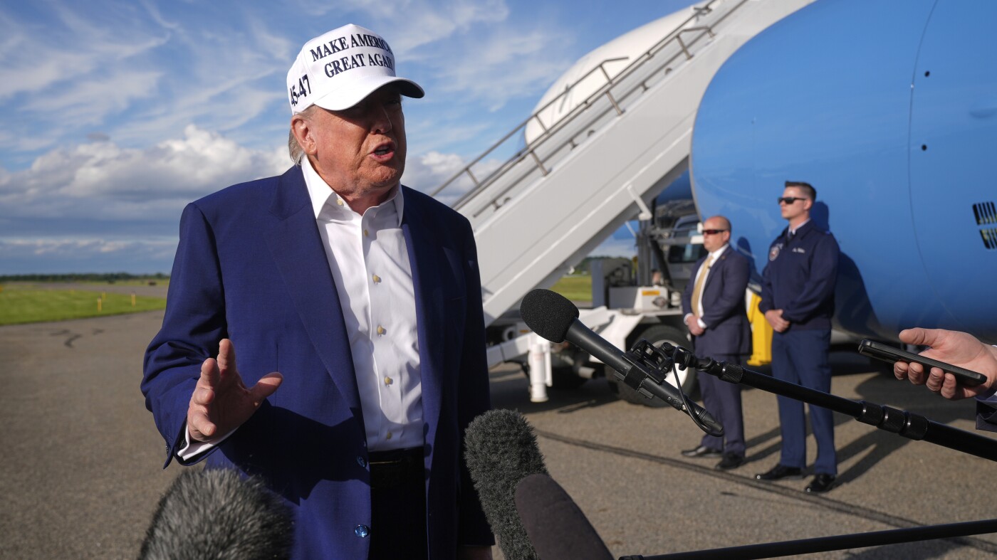 President Donald Trump speaks to reporters before boarding Air Force One at Morristown Municipal Airport in Morristown, N.J., on May 25, 2025.