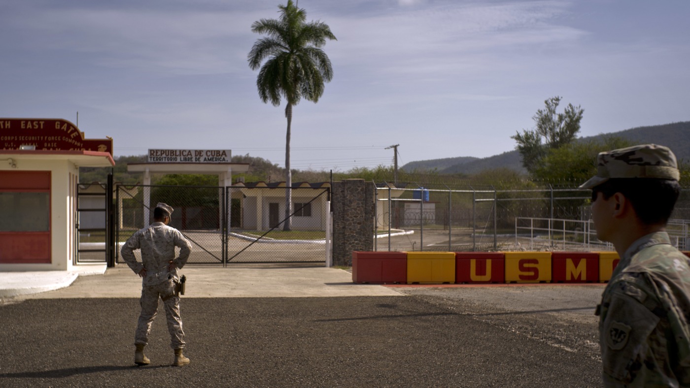 In this photo reviewed by U.S. military officials, an Army soldier, right, and a Marine stand in front of the gates that separate the Cuban side from the Guantanamo Bay U.S. Naval Base, June 6, 2018.