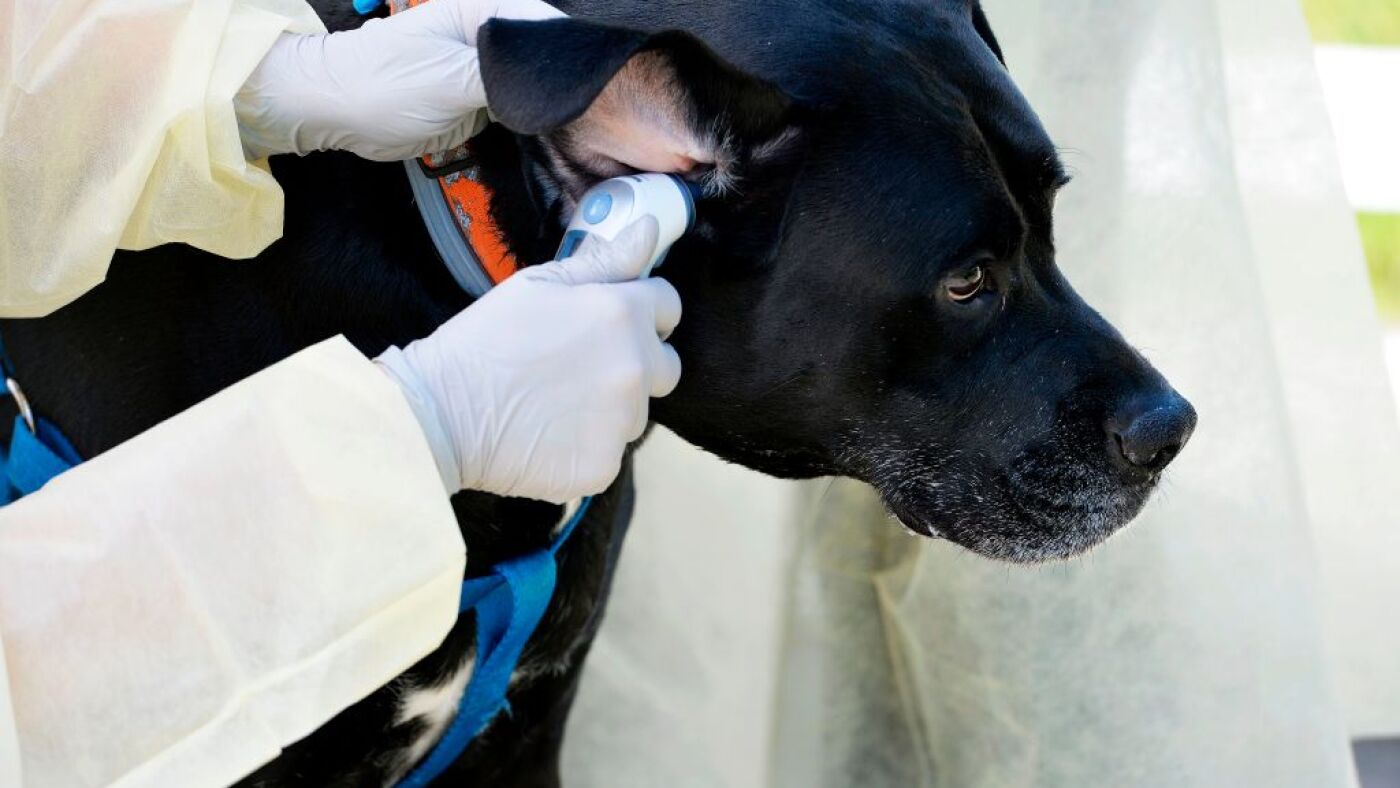 Veterinarian Janet Sosnicki, 36, checks the temperature of Theodore during a drive through veterinarian clinic at the Salem Animal Rescue League in Salem, New Hampshire on May 27, 2020. - Many veterinarian offices have been closed to the public during the pandemic and many have choses to do outside visits to reduce the spread of the covid-19 virus. (Photo by Joseph Prezioso / AFP) (Photo by JOSEPH PREZIOSO/AFP via Getty Images)