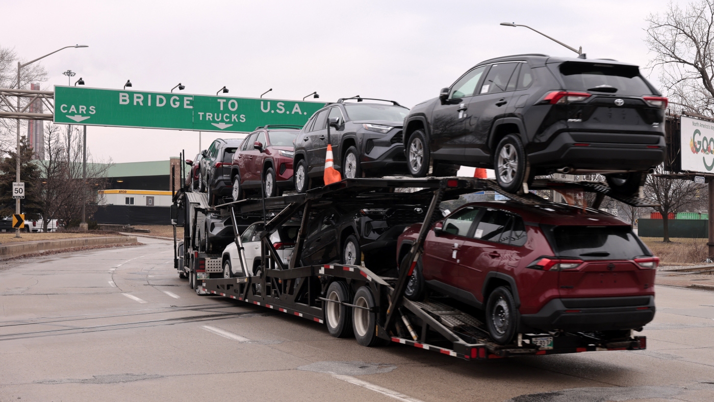 A car hauler carries Toyota RAV4 vehicles as it enters to cross the Ambassador Bridge in Windsor, Ontario to go to Detroit, Michigan on February 3.