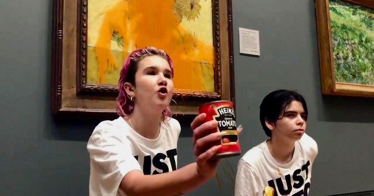 Climate protesters threw cans of tomato soup at Vincent van Gogh’s “Sunflowers” painting at the National Gallery in London, England, Oct. 14, 2022.