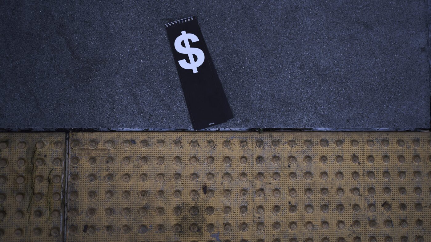 A price tag with a dollar sign lies on the sidewalk outside a Walmart store in La Habra, Calif., Wednesday, April 2.