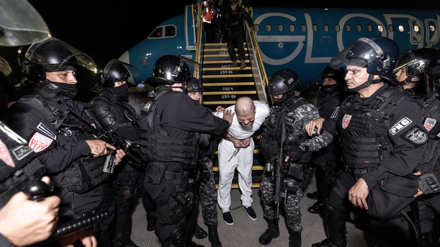 Salvadoran guards escort alleged members of the ‘Tren De Aragua’ and Mara Salvatrucha gangs who were deported from the U.S. to El Salvador.