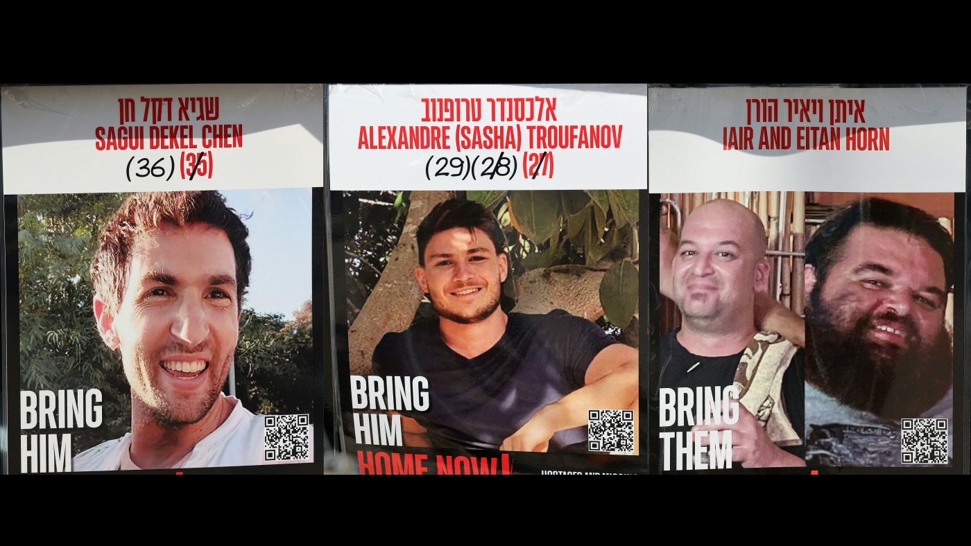This combination of pictures created on Friday shows posters of three Israeli hostages held in the Gaza Strip since the Oct. 7, 2023: Israeli American Sagui Dekel-Chen, Israeli Russian Alexander "Sasha" Trupanov and Israeli Argentinian Yair Horn. The office of Israeli Prime Minister Benjamin Netanyahu said it had received the names of three hostages to be released by Palestinian militants from Gaza Friday.