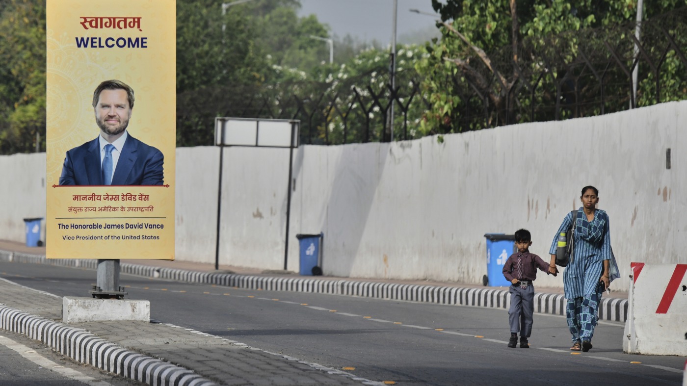 A woman and a child walk past a banner welcoming U.S. Vice President JD Vance on a street in New Delhi, India, on Monday.