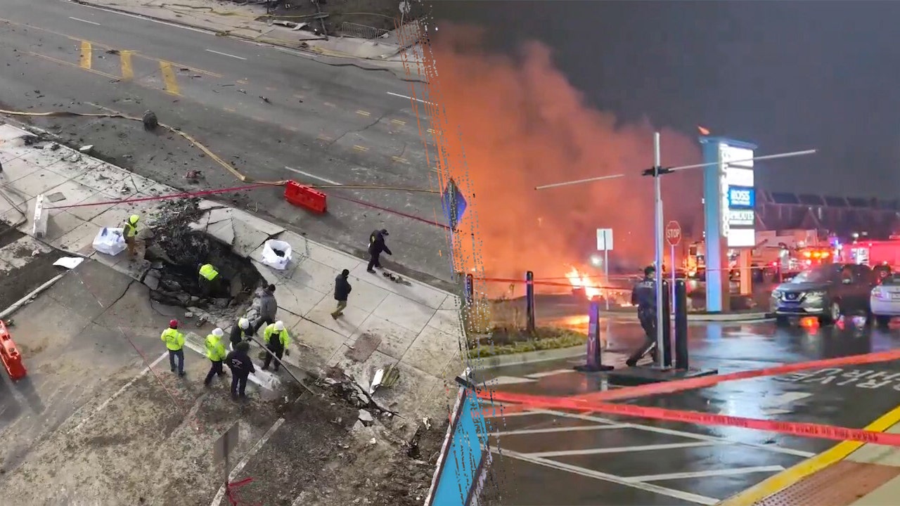 The shots recorded on Sunday showed the persecution consequences of the collision of Learjet 55. The swinging streets were scattered from debris, yellow ribbons and abandoned vehicles, as well as construction barriers guarding the location of the collision.