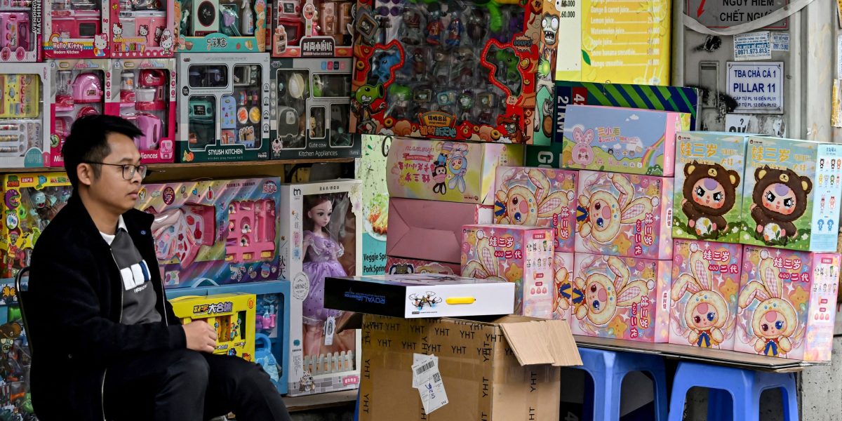 A person sitting in the store selling the child three dolls and other toys on a road in Hanoi on the way of thops a tension of thops with a tension of thops with a tension of thops that There is a fietnam tension in facial thops in facial thops with a tension of fietnam in a thops store with a fietnam tension in facial thops in a sea sea stains