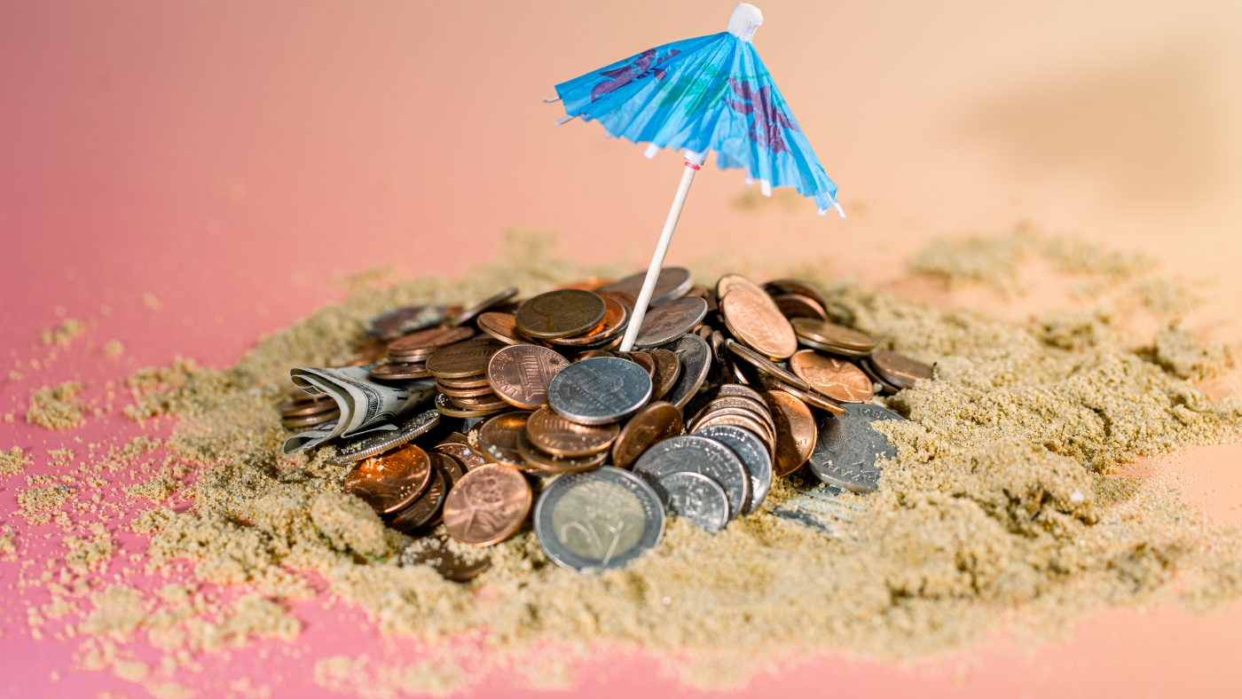Studio photograph showing a blue paper umbrella propped up in a mound of coins on sand in front of a pink and orange gradient backdrop