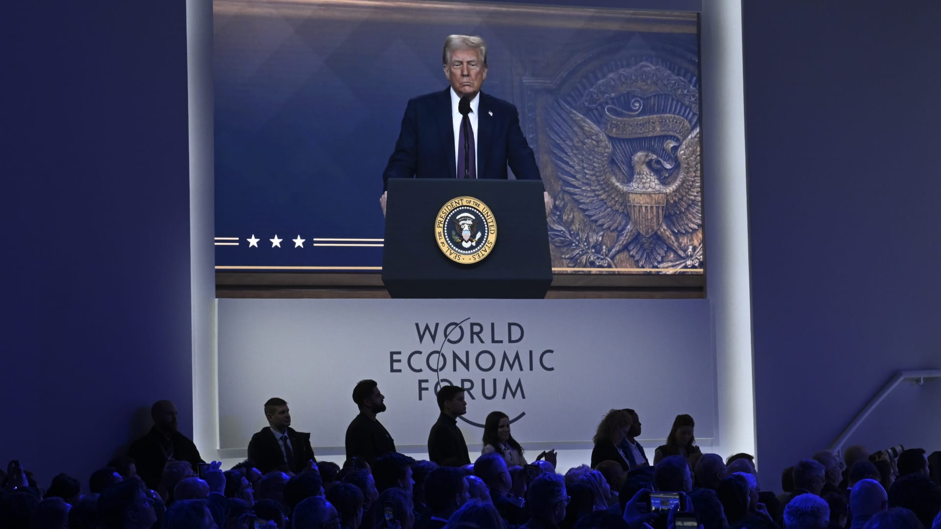 DAVOS, SWITZERLAND – JANUARY 23: President of the United States of America (USA) Donald Trump, delivers a speech via video conference during the 55th annual meeting of the World Economic Forum (WEF) in Davos, Switzerland on January 23, 2025. . (Photo by Halil Sagirkaya/Anadolu via Getty Images)
