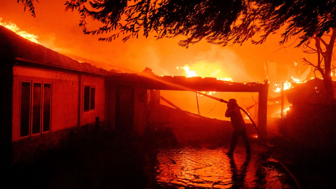 A firefighter douses flames during the Eaton Fire in Pasadena, Calif., on Jan. 8.