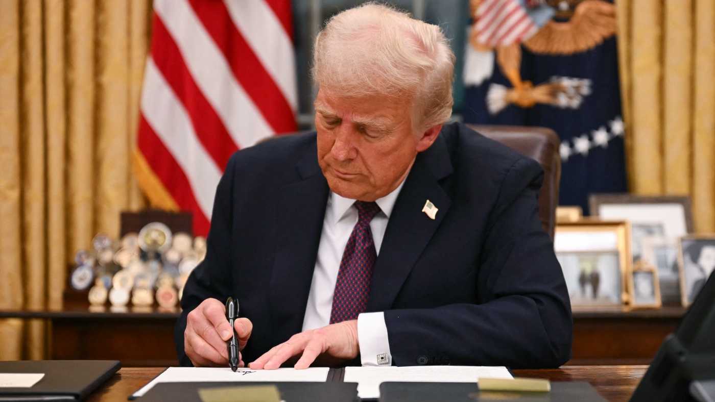 President Donald Trump signs an executive order on the Department of Government Efficiency, or DOGE, in the Oval Office on Jan. 20.