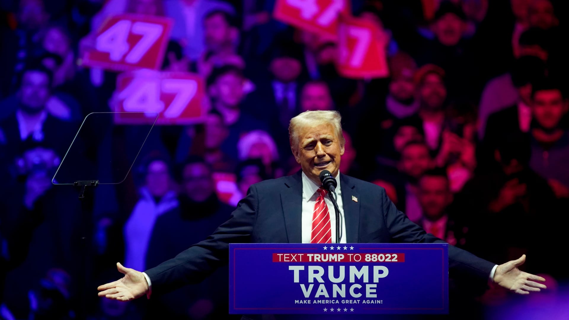 US President Donald Trump during a rally at Capital One Arena before the 60th presidential inauguration in Washington, DC, United States, Sunday, January 19, 2025.