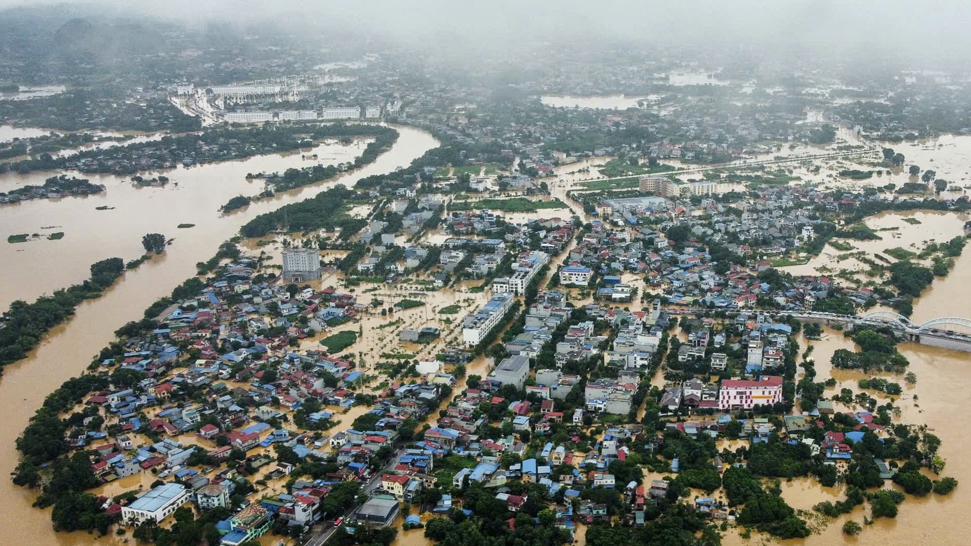 This aerial photo shows flooded streets and buildings in Thai Nguyen on September 10, 2024, just days after Super Typhoon Yagi hit North Vietnam.